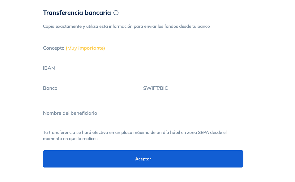 To recharge funds into the euros or FIAT wallet, you have the option of bank transfer.