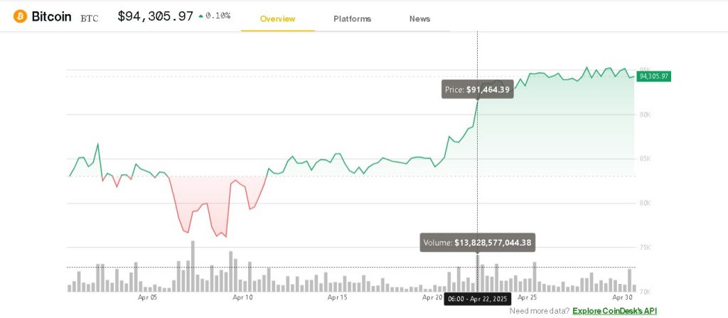 Le Bitcoin a commencé à sortir de la mauvaise passe qu’il traversait, atteignant même 76 000 dollars le 10 avril, selon les données fournies par CoinDesk ; cependant, son rebond le plus considérable s’est produit durant la troisième semaine d’avril, plus précisément à la clôture du 21 avril et au début du 22 avril, lorsqu’il a dépassé les 90 000 dollars.