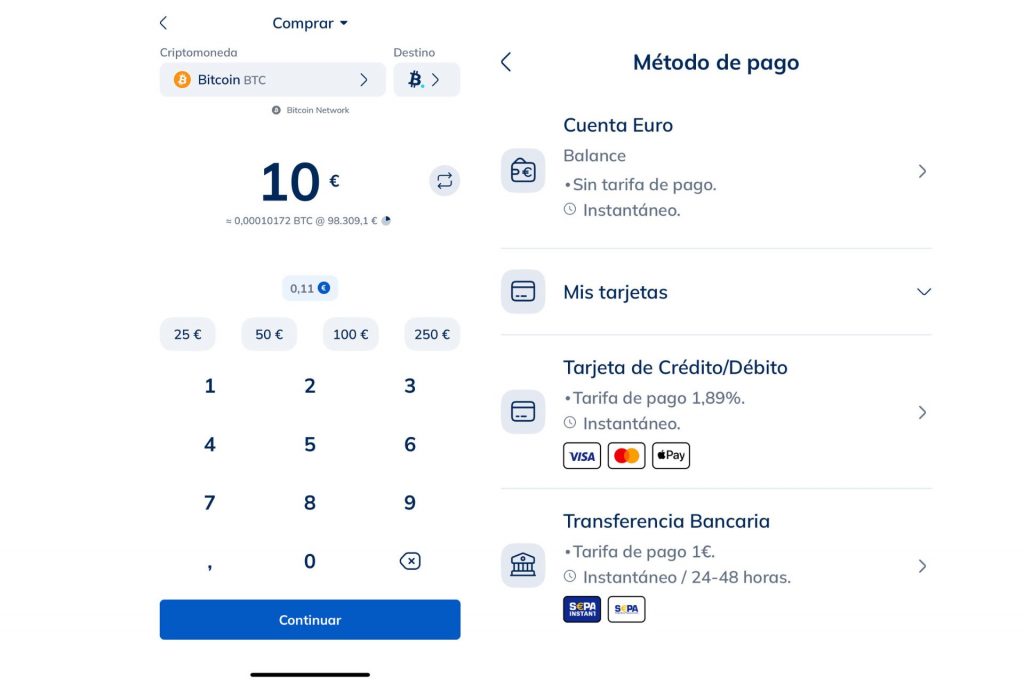 Passo 2: Escolha o valor e o meio de pagamento. Selecione BTC e insira 10 €. O sistema mostrará quanto Bitcoin você receberá. Escolha como pagar: cartão, transferência ou conta euro.
