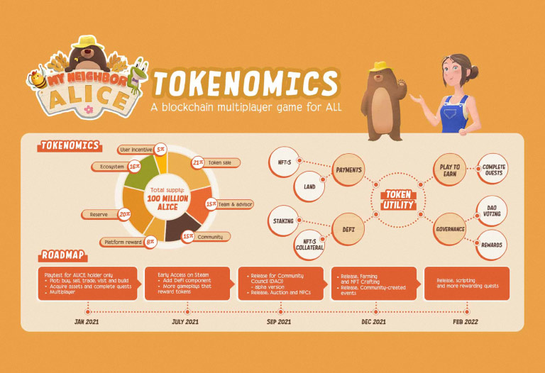 Siguiendo este punto, también se halla la parte de yield farming y las recompensas para los jugadores, con el fin de que participen activamente en la construcción de Alice.