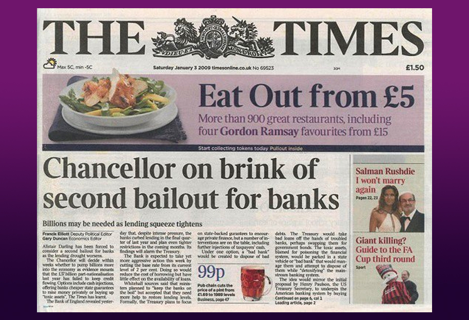 Este título pertenece al titular de un artículo publicado en el London Times el día 3 de enero de 2009 en el que se especificaba que los bancos estaban recibiendo la ayuda y rescate del gobierno británico.